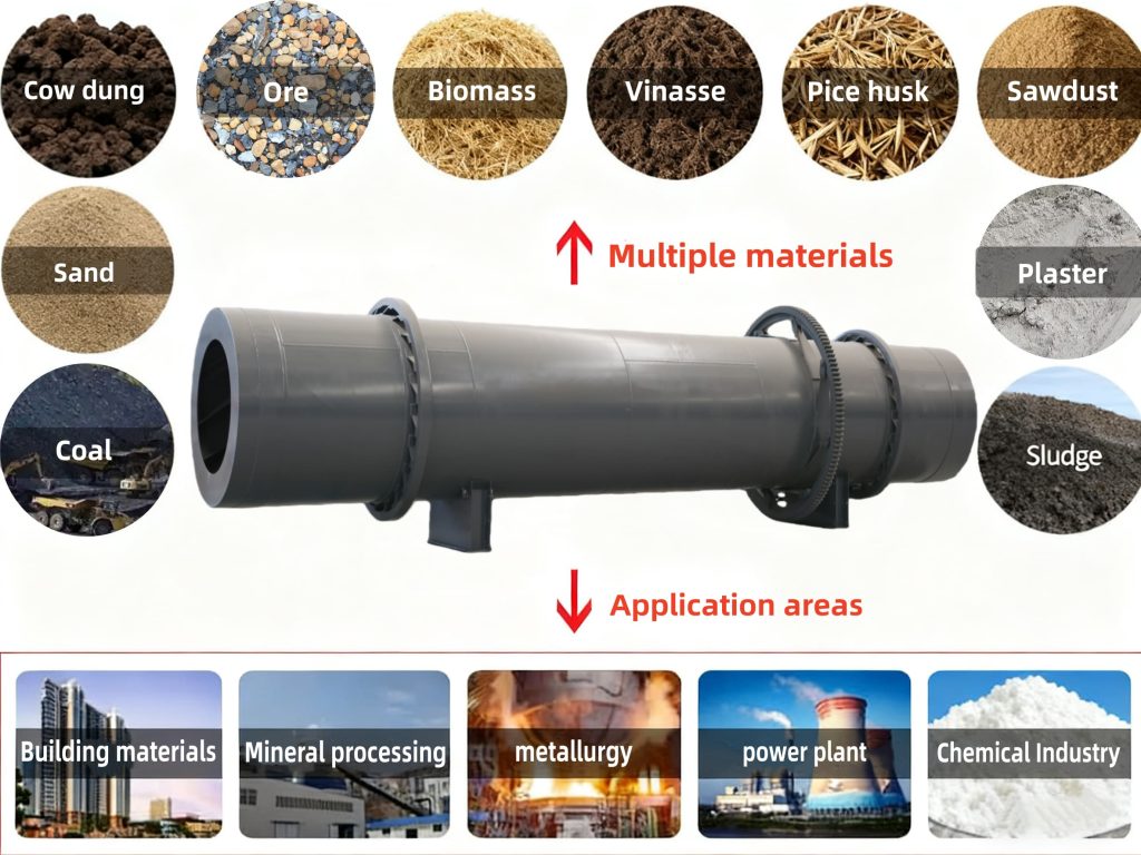 Industrial Dryer machines are equipment that achieves material drying through the rotation of a drum. Also known as roller dryers or rotary dryers, they represent the most common and widely applied drying equipment within industrial machinery. Drum dryers are employed to process substantial quantities of raw materials and find extensive use across industries including metallurgy, building materials, chemicals, coal, pharmaceuticals, and mining. Commonly dried materials encompass sand, mineral powder, coal dust, chicken manure, and cattle manure.